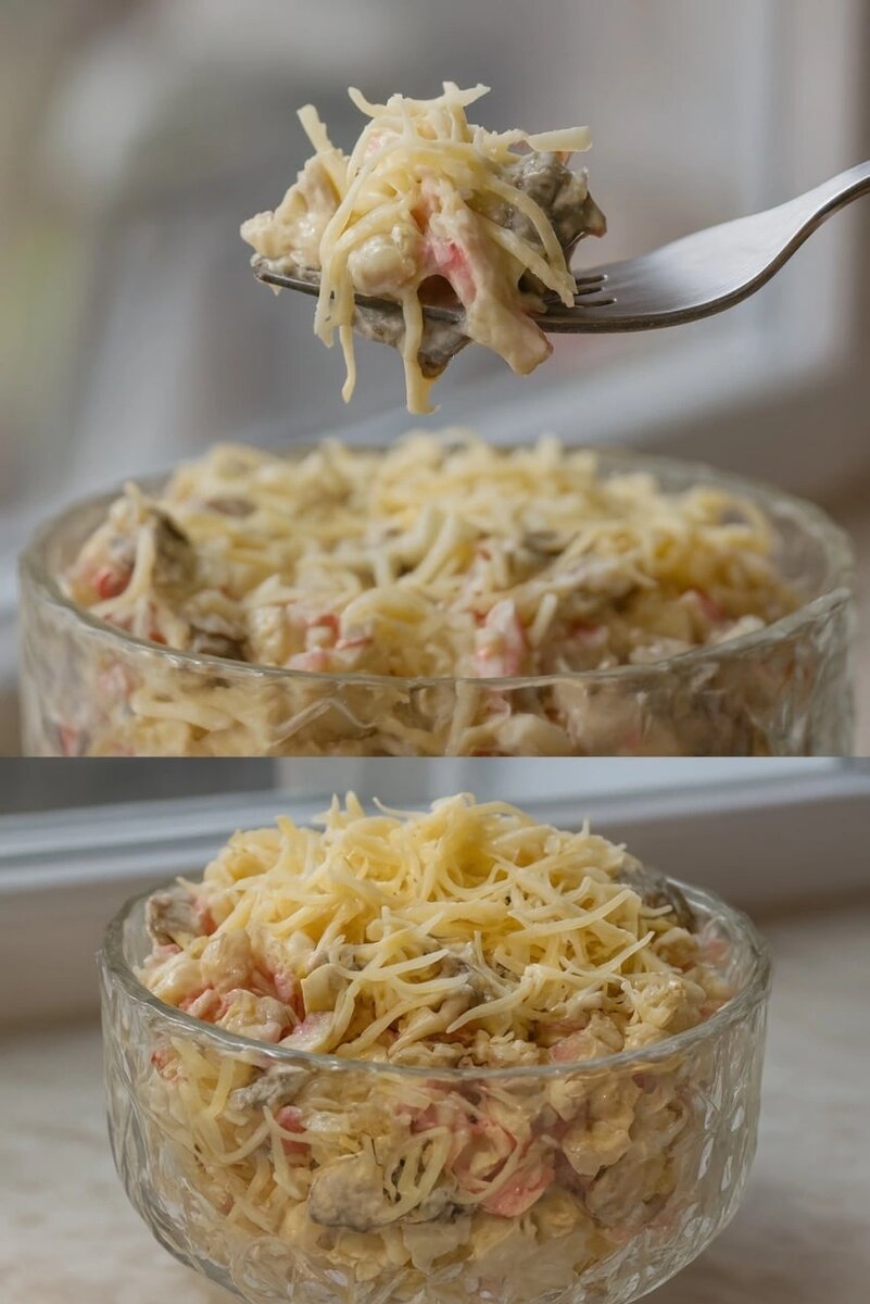Простой и вкусный салат, который действительно выручает, когда нужно быстро приготовить что-то сытное и аппетитное. Ингредиенты: * Крабовое мясо (или крабовые палочки) — 1 упаковка * Яйца (варёные) — 3 шт. * Шампиньоны — 250 г * Лук — 1 шт. * Сыр — по вкусу * Майонез — по вкусу * Зелень (по желанию) Приготовление: 1. Лук нарежьте кубиками и слегка обжарьте на разогретой сковороде с маслом. 2. Добавьте нарезанные шампиньоны, посолите, поперчите и готовьте до мягкости. 3. Отварные яйца нарежьте кубиками и переложите в миску. 4. Смешайте с обжаренными грибами и луком. 5. Мелко нарежьте крабовое мясо и добавьте в салат. 6. По желанию добавьте рубленую зелень. Заправьте майонезом и хорошо перемешайте. 7. Сверху натрите сыр для красивой подачи и более насыщенного вкуса. Приятного аппетита! 😋