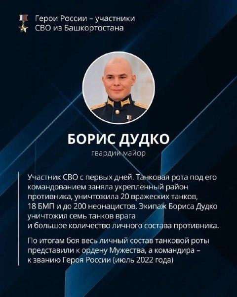 Звание Героя России присваивается за проявленные мужество и самоотверженность, стойкость и отвагу, за геройский подвиг во имя Отечества. Герои России из Башкортостана наши современники получили это высокое звание в ходе выполнения боевых задач на СВО. 14 патриотов, вставших на защиту нашей Родины и выполнивших свой воинский и гражданский долг, были удостоены звания Героя Российской Федерации, восемь из них посмертно. Некоторые из живых героев продолжают деятельность на благо Отечества они стали участниками образовательной программы «Время героев», инициированной Президентом России Владимиром Путиным. В наших карточках рассказ о подвигах Героев из Башкортостана, смотрите! Источник https://uchaly102.ru/?p=115121