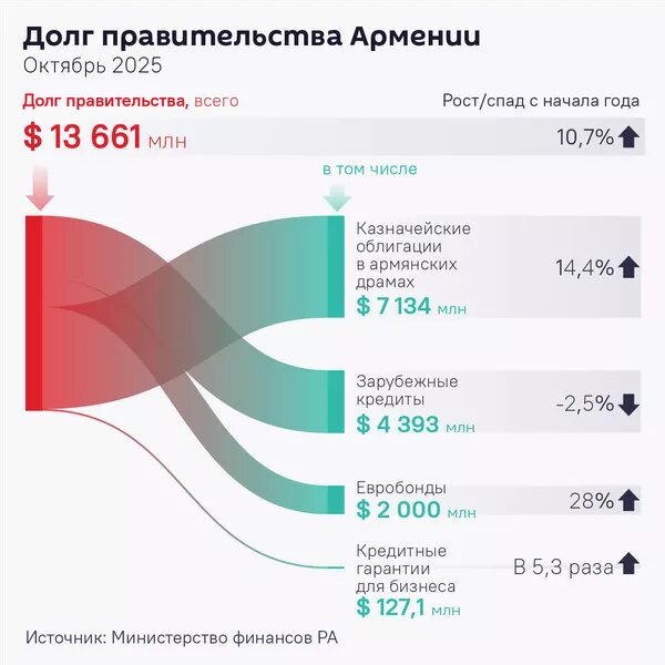 Как и в предыдущие несколько лет, сокращается доля зарубежных кредитов и растет – казначейских облигаций в национальной валюте (считается, что их привлекать выгоднее, чтобы выплаты по долгу оставались внутри страны, а не уходили за рубеж). Долг правительства Армении с начала 2025 года, по состоянию на конец октября, вырос на 10,7%, составив $13 млрд 661 млн, сообщает Статистический комитет Армении. В управлении долгом, Минфин продолжает политику последних нескольких лет – зарубежные кредиты хотят максимально заменить внутренними займами (государственными облигациями). Эта тенденция продолжилась и в течение 2025 года: по сравнению с декабрем 2024-го доля внутреннего долга выросла с 51,8% до 53,5%, а внешнего – сократилась с 48,2% до 46,5% (в частности, по линии зарубежных кредитов – с 36,5% до 32,2%). Минфин считает внутренний долг предпочтительным: с одной стороны, у гособлигаций в нацвалюте значительно выше процентная ставка (в районе 10,5% годовых), чем у зарубежных кредитов (3-3,5%