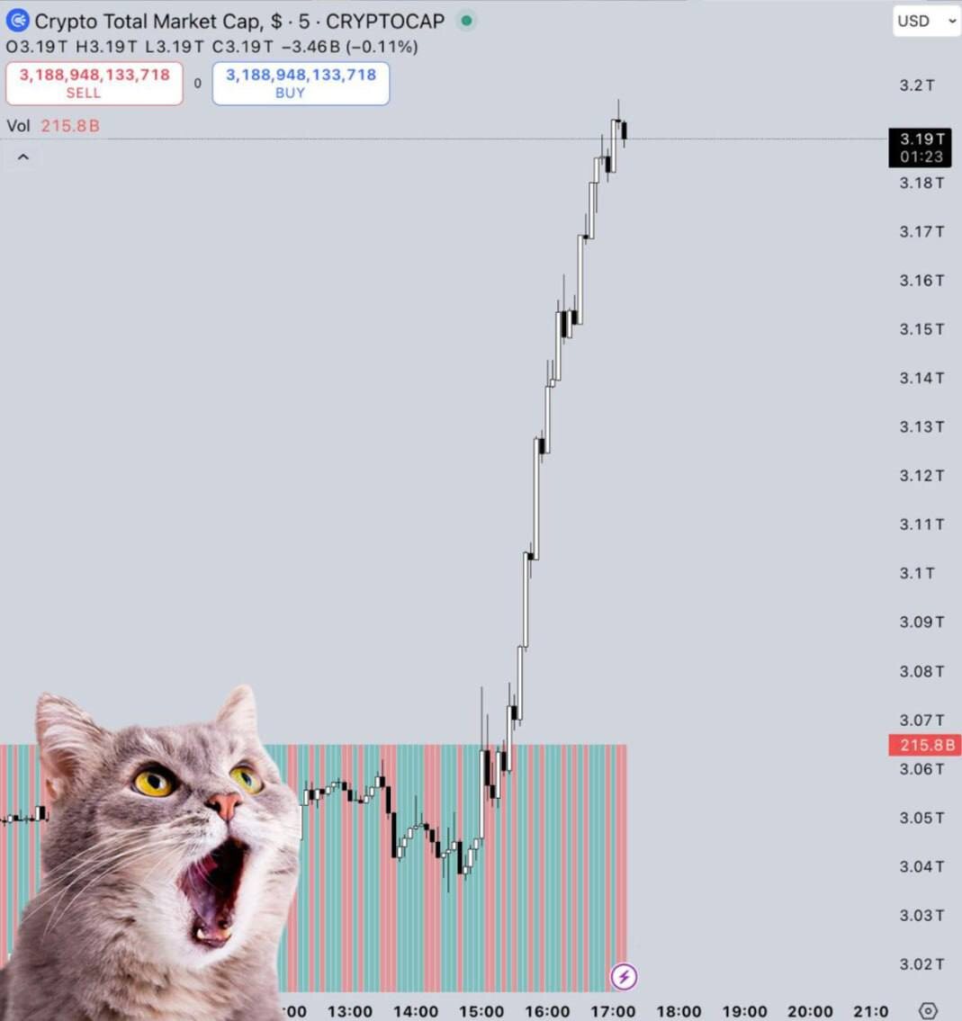 🔥 Крипторынок прибавил $150,000,000,000 рыночной капитализации всего за 1,5 часа.