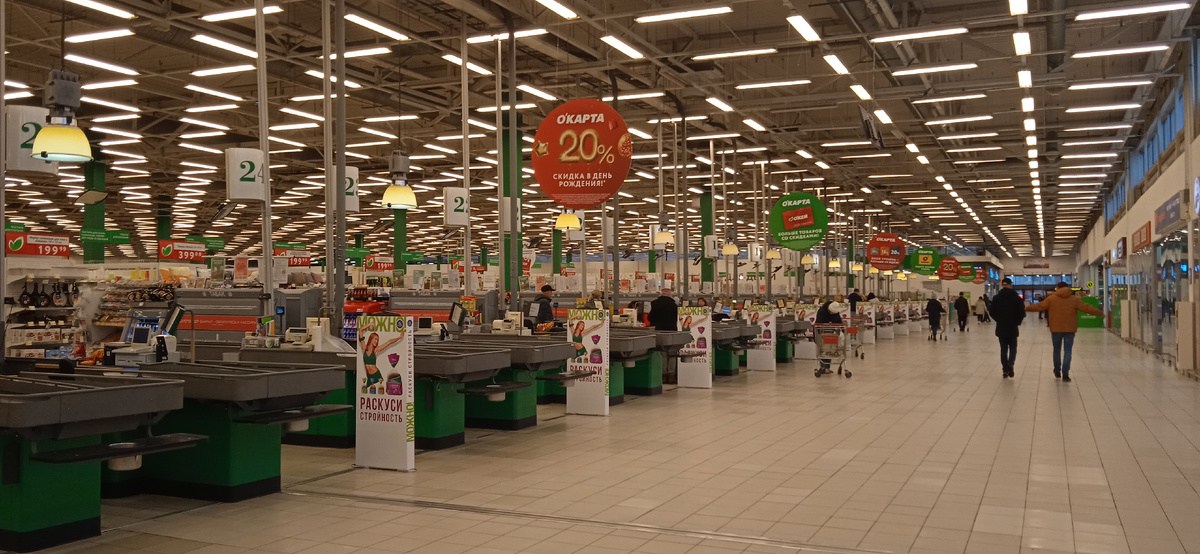 Давно не посещали магазин Окей и как-то про него забыли. Решили его посетить и были удивлены отсутствием покупателей. Еще несколько лет назад здесь было нашествие покупателей и было не протолкнуться... Из 35 касс работает всего три и это говорит о том, что не нужны теперь такие гигантские маркеты Овощей и фруктов предоставлено в изобилии, но цены просто неадекватные... От цен на тушенку глаза лезут на лоб... В посудных рядах запустение и мы тоже оттуда бегом. Ничего не надо!!! Не дай бог что-нибудь купить... Мимо рядов с изобилием посуды прошли мимо и, слава богу, я ничего не схватила... Мужчина перед нами на кассе купил бутылку пива и еще там что-то. После него и мы оплатили свои два одиноких батона Возле Окея, впритык возвели очередной жилой квартал. Место здесь депрессивное и долго здесь находиться не хочется. Давящая на мозги атмосфера не позволят долго здесь находиться. Любоваться здесь абсолютно нечем, друзья... В Пятерочке возле дома купили нескол