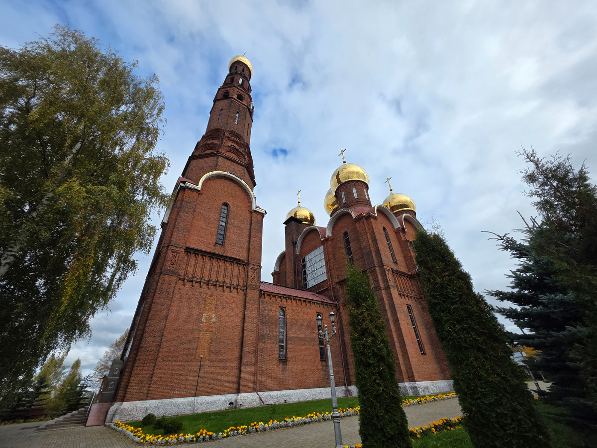 Представьте: вы едете по трассе, где впереди ещё не видно самого города, но вдруг вдалеке вырастает гигантская бело-красная «свеча» с шатровой колокольней. Это Воскресенская церковь, построенная в 1911 году в стиле неорусский модерн.