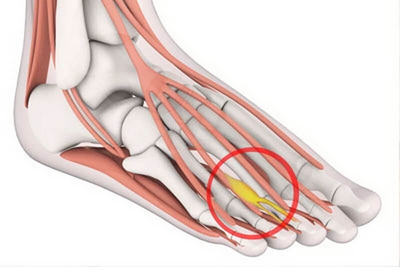 вокруг одного из нервов, ведущих к пальцам ног. Это может вызвать ощущение, будто вы стоите на камешке в ботинке, жгучая боль в подушечках