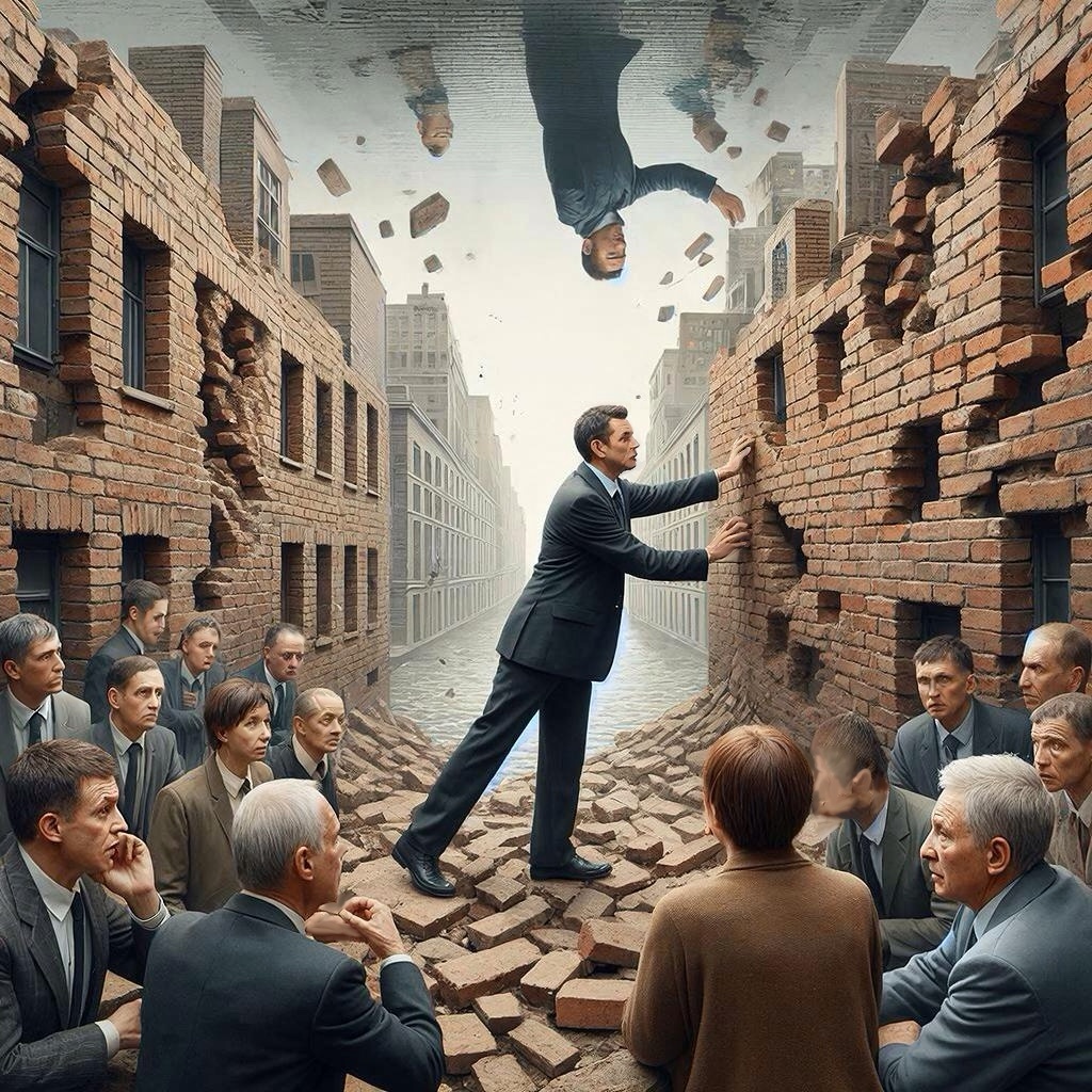 Представьте город, где каждое здание построено из краденых кирпичей, но архитектурные стили смешались так, что невозможно найти первоисточник; люди на улицах обмениваются украденными взглядами и речью, а небо над городом — это огромное зеркало, в котором каждый видит не своё отражение, а образ того, кого он ограбил, чтобы стать собой. В центре города — адвокат, который пытается вырвать из стены один кирпич, чтобы доказать, что он краденый, но весь город начинает рушиться, и жители смотрят на него не со злобой, а с жалостью: «Зачем лишаешь нас дома?»