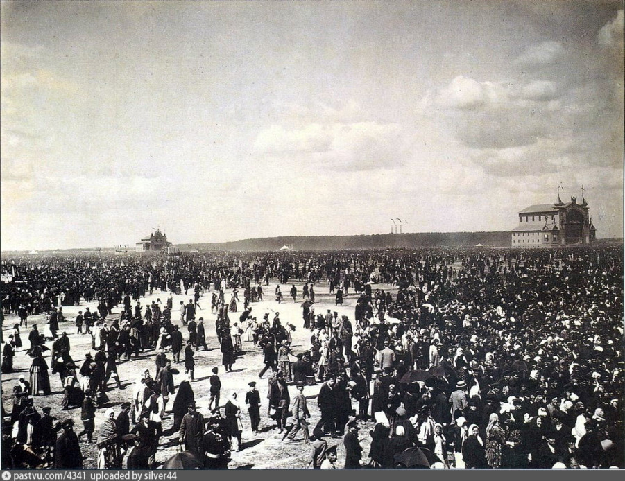 - Раннее скопление толпы. Ещё до рассвета масса людей плотно заполнила пространство перед буфетами (палатками для раздачи подарков). Узкая площадка перед ними была отделена от поля глубоким рвом.