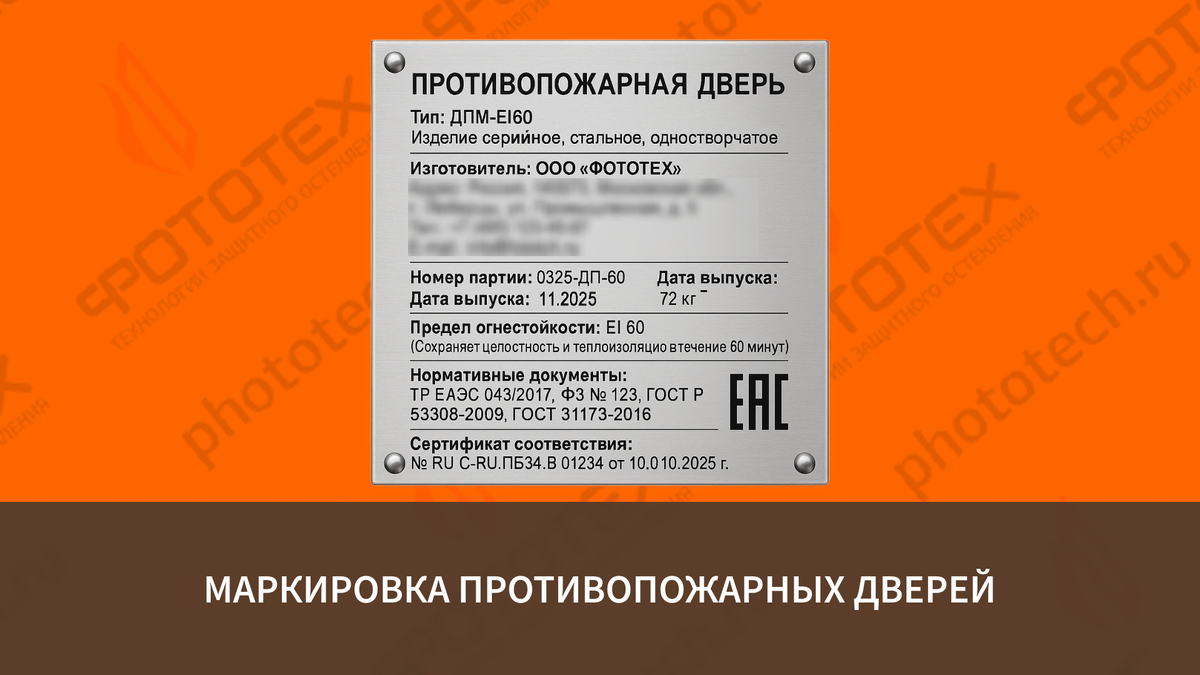 Противопожарные двери — это ключевые элементы противопожарных преград, которые должны не только соответствовать проекту, но и подтверждать свою огнестойкость документально. Одним из важнейших элементов контроля является маркировка — информация, нанесённая на металлический шильд и в паспорт изделия. Именно она показывает, что дверь изготовлена и испытана по требованиям ТР ЕАЭС 043/2017, ФЗ-123 и ГОСТ Р 53308-2009. Зачем нужна маркировка? Маркировка обеспечивает однозначную идентификацию двери: при приемке, при проверке пожарным инспектором, в период обслуживания и даже после пожара. Она подтверждает происхождение изделия, класс огнестойкости и технические характеристики. Если маркировка отсутствует или не совпадает с паспортом, дверь считается неподтверждённой и не может применяться как противопожарная преграда. Основные обозначения огнестойкости В маркировке используются стандартные буквы: