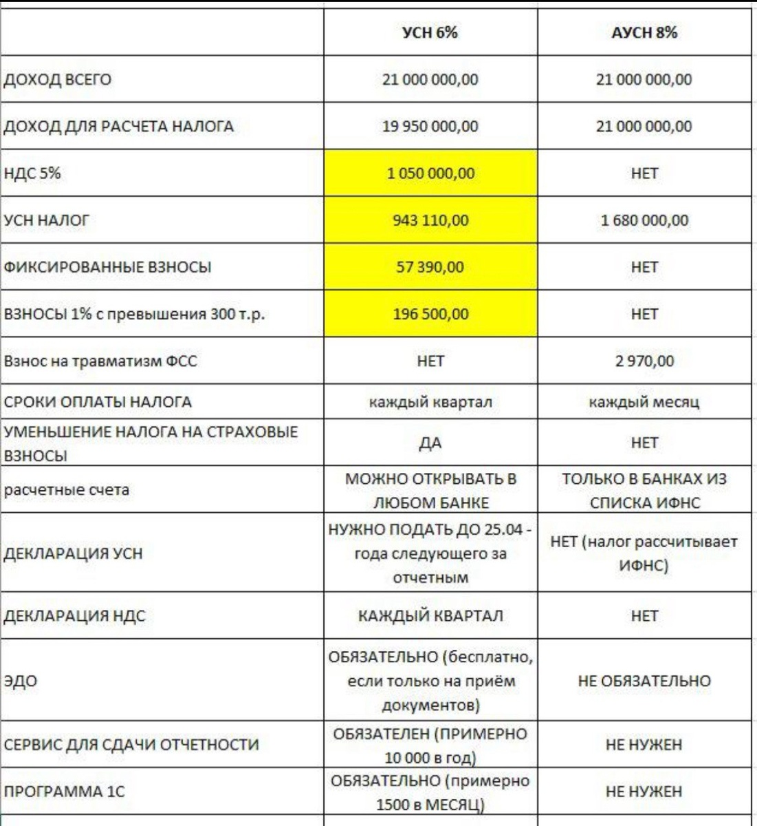 При доходе 21 млн рублей выбор между УСН 6% и АУСН 8% перестаёт быть формальным вопросом и напрямую влияет на итоговую налоговую нагрузку бизнеса. Оба режима работают по модели «доходы», но отличаются правилами расчёта, возможностью оптимизации и качеством налогового администрирования. Чтобы понять, какой вариант выгоднее именно при таком обороте, важно сравнить не только ставки, но и скрытые расходы, ограничения и особенности применения каждого режима. Налоговая нагрузка при доходе 21 млн ₽ При выборе режима важно учитывать не только ставку налога, но и обязательные взносы, особенности расчёта базы и дополнительные платежи. Ниже — расчёт налоговой нагрузки по каждому режиму при доходе 21 000 000 ₽. УСН 6% ("доходы") Расчёт на УСН включает не только сам налог, но и ряд обязательных взносов, которые формируют итоговую нагрузку. Доход: 21 000 000 ₽ База после уменьшения: 19 950 000 ₽ НДС (5%): 1 050 000 ₽ Налог УСН 6%: 943 110 ₽ Фиксированные страховые взносы: 57 390 ₽ Дополнительный вз