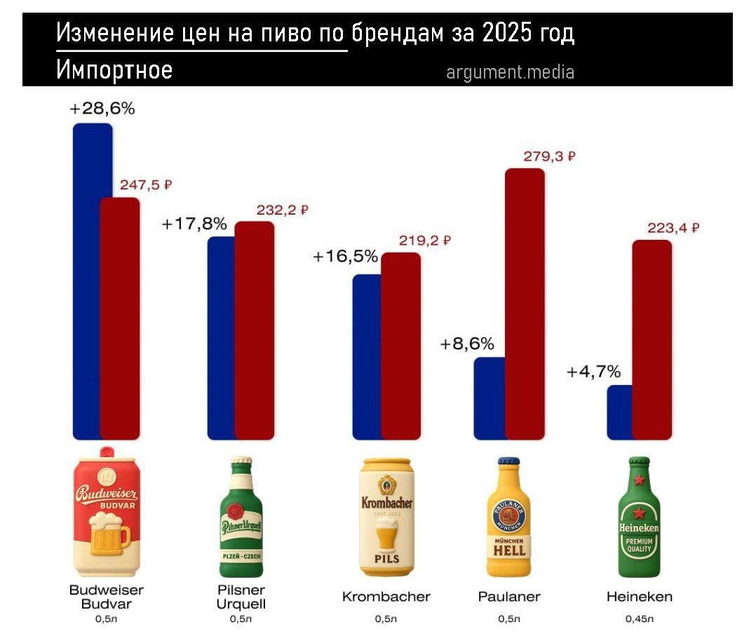 Пиво подорожало Государство подняло пошлины на импортное пиво. Импорт, естественно, подорожал. За год цена на зарубежное выросла на 18,6%. Логика простая: выше растаможка → выше ценник. Вместе с импортом подскочили и цены на отечественное пиво, хотя для российских производителей не изменилось ровно ничего. Ни пошлин, ни логистики, ни акцизов. Тем не менее рост получился почти зеркальный: +15% за год. Это и есть чистая статистика: когда часть рынка вынужденно поднимает цену, вторая часть просто увеличивает норму прибыли. Если смотреть по маркам, картина ещё нагляднее: 🍺 Балтика → +18,3% 🍺 Белый медведь → +14,7% 🍺 Хамовники → +13,5% 🍺 Старый мельник → +14,1% 🍺 Жигули → +11,3% 🍺 Охота → +20% То есть импорт дорожает из‑за пошлин, а отечественное за компанию, пользуясь моментом. Никаких новых издержек. Никакой "поддержки отечественного". Только оптимизация маржи в пользу производителя. А как же завоевать долю рынка? Расширить производство? Как говорят на АвтоВАЗе, "можем