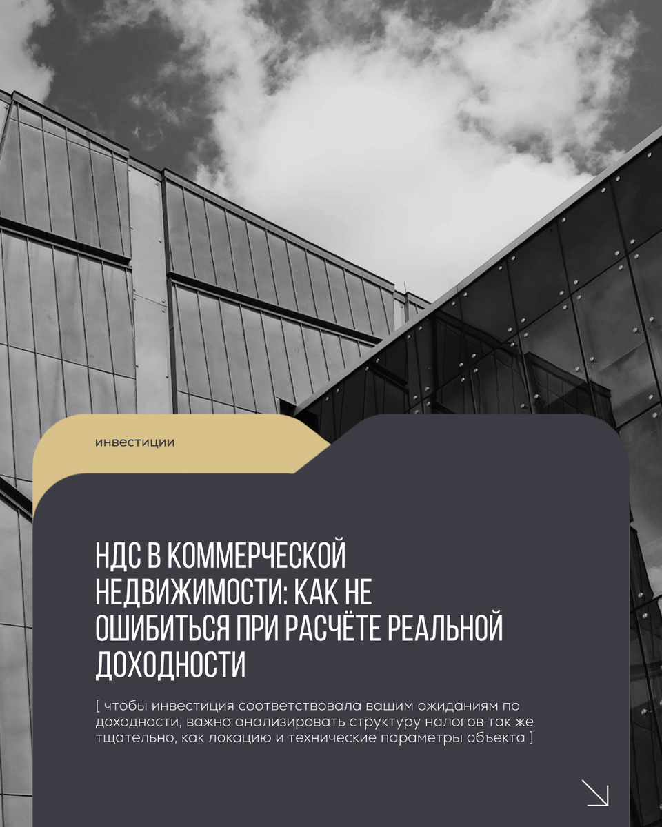 При выборе объекта многие инвесторы смотрят только на ставку доходности и стоимость аренды. Но есть фактор, который способен кардинально изменить финансовый результат — наличие или отсутствие НДС. Объект с НДС изначально кажется дороже, однако для арендаторов-плательщиков НДС это зачастую выгоднее, поскольку они принимают налог к вычету. В итоге арендные ставки по таким помещениям чаще выше, а пул потенциальных арендаторов шире. Это напрямую влияет на заполняемость и стабильность денежного потока. Объекты без НДС на первый взгляд выглядят привлекательнее по цене, но фактически это работает только для арендаторов на упрощённой системе налогообложения. В остальных случаях отсутствие НДС снижает экономическую эффективность сделки и ограничивает спрос со стороны крупных компаний. Поэтому корректная оценка доходности невозможна без учёта налоговой модели актива и налогового статуса будущего арендатора. 📎 Вывод Чтобы инвестиция соответствовала вашим ожиданиям по доходности, важно ана