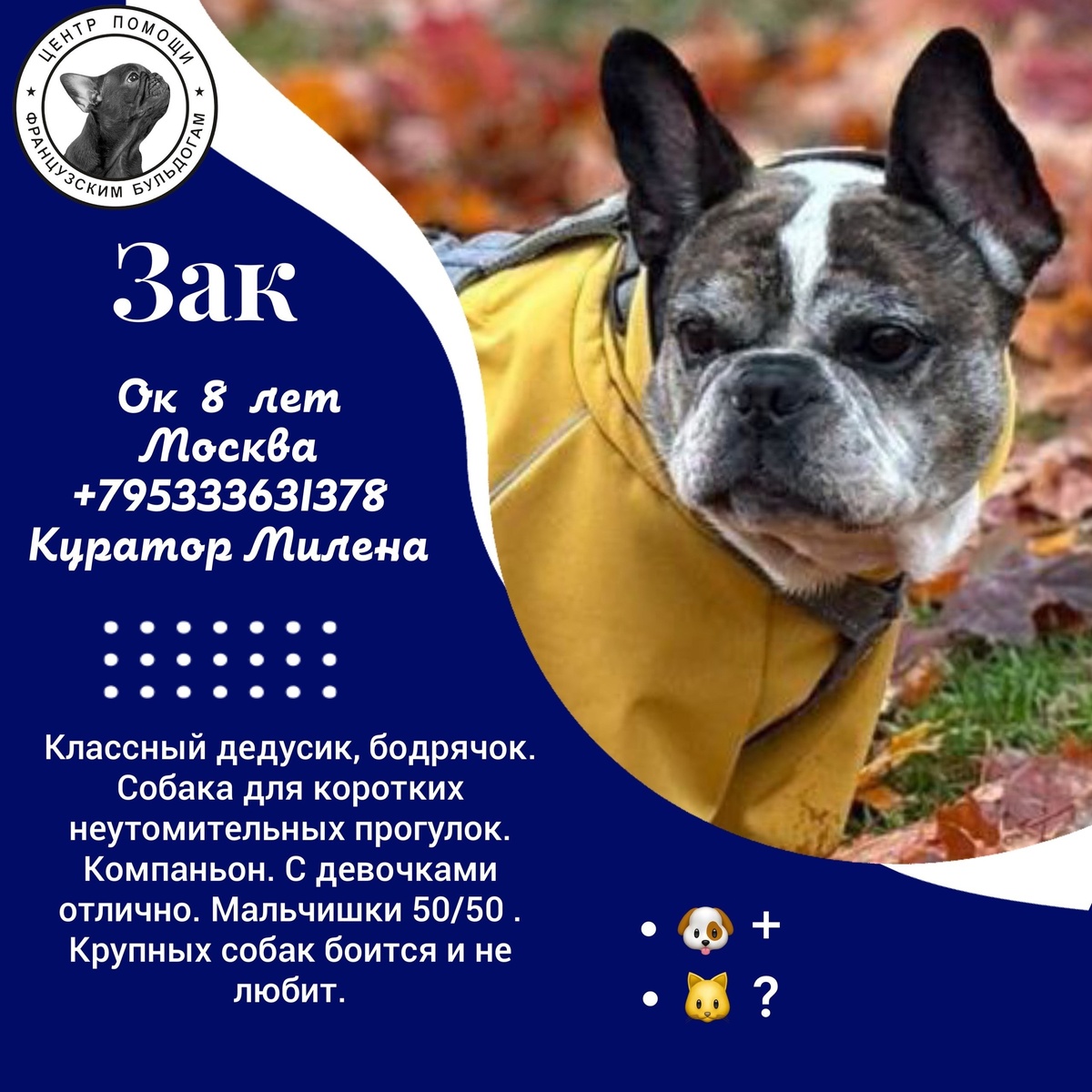 ↩ Milena Kalinovskaia ⬇ Из песни слов не выкинешь... Наш Захар Захарыч ищет сегодня , сейчас, еще вчера своего человека, семью для себя, где нет и не будет причин для расставаний. Семью , где каждый прожитый день, час, год принадлежал бы ему. Где счастливы были бы его присутствию!!!! Наскитался . Обжегся. Разочарован. #Зак@frenchbull_help https://vk.com/topic-144285450_53852905 Находится в Москве. Все вопросы по усыновлению на ватсап и Тг +7 953 336 31 78 Милена Пишите пообщаемся.