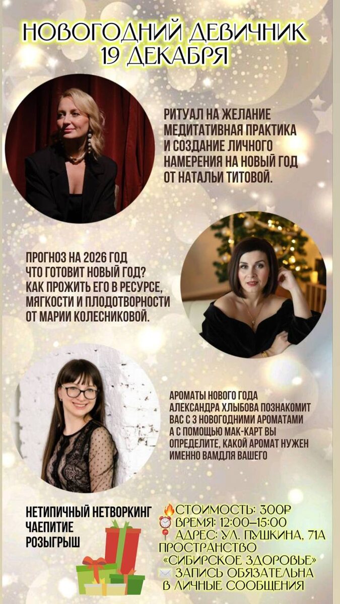 🌲 НОВОГОДНИЙ ДЕВИЧНИК Тёплая, волшебная и ресурсная женская встреча в кругу энергии, поддержки и предновогоднего настроения. 🌟 В ПРОГРАММЕ ДЕВИЧНИКА: 1️⃣ Нетипичный нетворкинг Лёгкое, живое и весёлое знакомство — без неловкости, зато с тёплой атмосферой. 2️⃣ Ритуал на желание Медитативная практика + создание личного намерения на Новый год от Натальи Титовой. 3️⃣ Прогноз на 2026 год Что готовит новый год? Как прожить его в ресурсе, мягкости и плодотворности от Марии Колесниковой. 4️⃣ Ароматы Нового года Александра Хлыбова познакомит вас с тремя новогодними ароматами — радости, силы и тепла. А с помощью МАК-карт вы определите, какой аромат нужен именно вам для вашего Внутреннего света 5️⃣ Чаепитие Уютное, вкусное, атмосферное — с полезными угощениями. 6️⃣ Розыгрыш Приятные сюрпризы и волшебные подарки. 🎄 Стоимость: 300₽ 📅 Дата: 19 декабря ⏰ Время: 12:00–15:00 📍 Адрес: ул. Пушкина, 71А пространство «Сибирское здоровье» ✉️ Запись обязательна в личные сообщения Места ограничены!