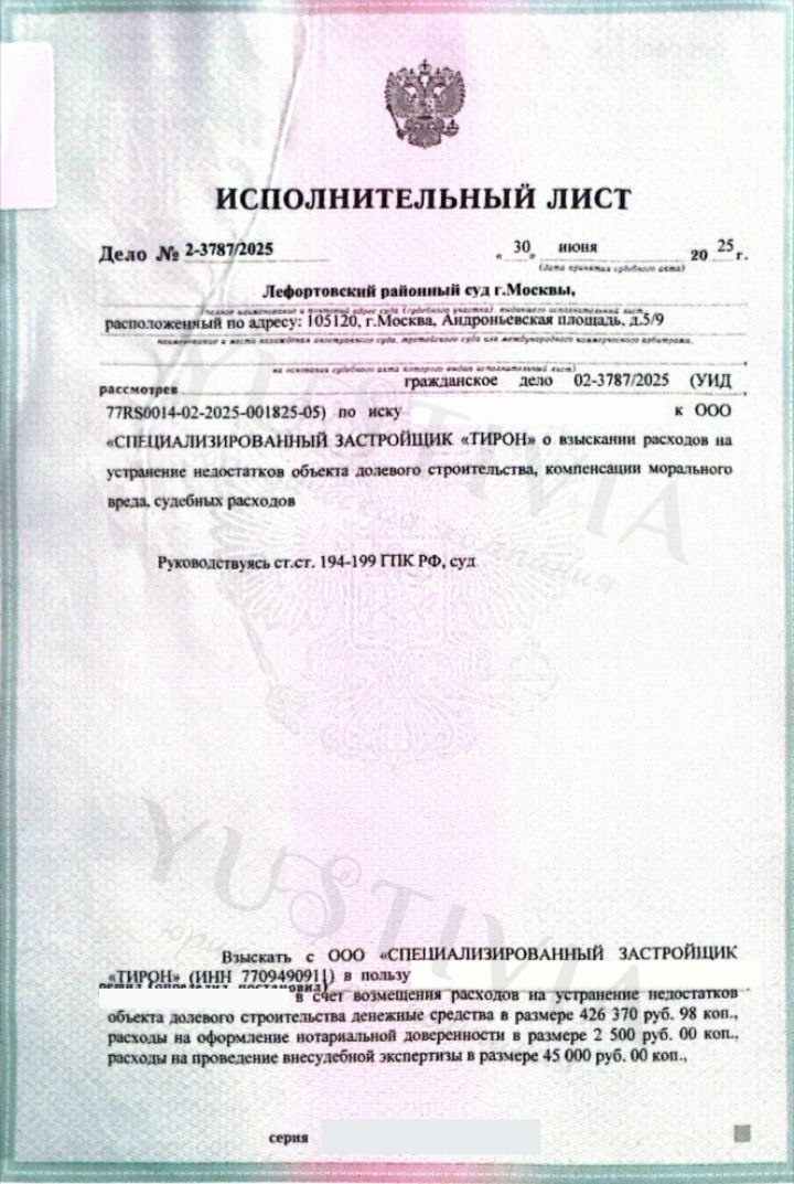 📘Получен исполнительный лист по Застройщику: ООО "СЗ "ТИРОН" 😀 ➿➿➿➿➿➿➿➿➿ О взыскании компенсации за строительные недостатки по договору долевого участия Лефортовский районный суд города Москвы Дело: 02-3787/2025 Площадь: 84,60 м² Судья: Федюнина С.В. ➿➿➿➿➿➿➿➿➿ Взысканные суммы: ➡️Недостатки: 426 370,98; ➡️Суд. расходы: 103 136,02. ➿➿➿➿➿➿➿➿➿ 💸Итого: 529 507 рублей. ❤️Приёмка квартиры и строительно-техническая экспертиза за счёт компании! Юстивия – мы на вашей стороне в борьбе за справедливость!🆗 ➿➿➿➿➿➿➿➿➿ 📞+7 (936) 333-33-48 ✅@Yustivia 🌐yustivia.ru