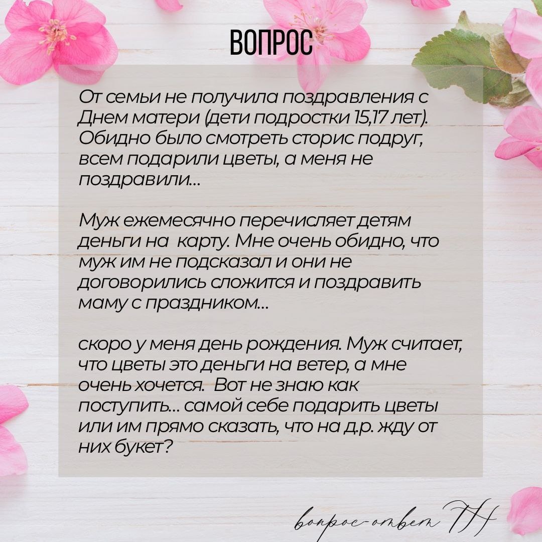🧡Чувствуется много обиды и неоправданных ожиданий. ☑️Вот о чем можно подумать: ⬇️Уверены ли вы, что в соц сетях прям всем дарили цветы? Что кто-то сам себе не купил? ⬇️Действительно что такого в том, чтобы купить себе цветы самой? (По секрету🧡: я постоянно держу дома живые цветы, покупаю сама, какое удовольствие выбрать те, которые приглянулись) ⬇️Обижаетесь на детей или мужа? Слышится обида на мужа ("не подсказал детям "), как будто много недоговоренностей? ⬇️Ждать чего-то от детей тоже так себе идея, мы растим их не ожидая ничего взамен, или нет? "Реки не текут вспять" ⬇️Стоят ли цветы конфликта? Он их никогда не дарил? И вас это устраивало? Или перестал дарить? ⬇️Что произошло в ваших отношениях и когда, что вдруг он не хочет дарить, а вы стали чувствовать острую потребность в этом? Что за этими цветами? Как будто что-то большее ⬇️Как будто эта история про значимость, нужность, важность, потребность быть увиденной, потребность в заботе... Поговорите с мужем, как вам это ва