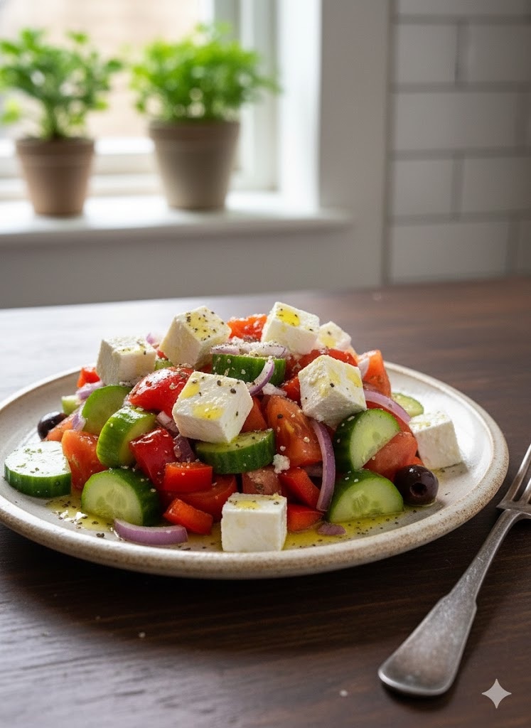 📝 Ингредиенты Помидоры: 4 шт. (крупных и спелых) Огурцы свежие: 1 шт. (крупный) Сладкий перец (лучше зеленый, но можно красный/желтый): 1 шт. Красный лук: ½ шт. Сыр Фета (цельным куском или кубиками): 150–200 г Оливки (лучше Каламата, с косточкой или без): 100 г Для заправки Оливковое масло Extra Virgin: 4–5 ст. л. Уксус винный (красный) или лимонный сок: 1–2 ст. л. Сушеный Орегано: 1 ч. л. Соль, черный перец: по вкусу (осторожно, Фета и оливки уже соленые) 🔪 Пошаговое приготовление Нарезка овощей: Помидоры, огурцы и сладкий перец нарежьте достаточно крупными кусками (кубиками 2–3 см). Лук: Красный лук нарежьте тонкими полукольцами. Если лук слишком острый, можно замочить его в холодной воде на 10 минут, а затем обсушить. Сборка: В большой миске соедините помидоры, огурцы, сладкий перец и лук. Заправка: В небольшой миске смешайте оливковое масло, уксус (или лимонный сок), сушеный орегано, черный перец и щепотку соли. Тщательно перемешайте. Добавление добавок: Добавьте в салат