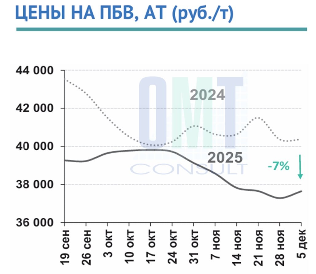 Цены на полимерно-битумные вяжущие в период с 1 декабря по 5 декабря 2025 г. повысились в целом по РФ на 1% по сравнению с предыдущей неделей и составили 37 641 руб./т.