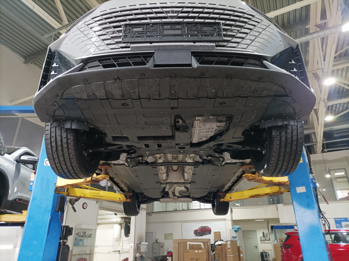 Машина с достаточным клиренсом и металлическим поддоном, прикрытым балкой/подрамником.