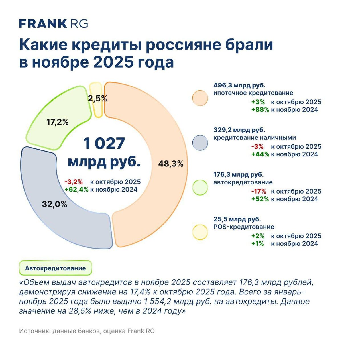📶 ☺️Эксперты Frank RG оценили ноябрьские выдачи всех розничных кредитов. Объем выдач кредитов физ лицам в ноябре 2025 года снизился на 3,2% по сравнению с октябрем и составил 1 трлн рублей (-34,2 млрд руб). 😱⬇️Наибольшее снижение было замечено в сегменте автокредитования. Рынок автокредитов показал снижение объема выдач на 17,4% к октябрю. 😊⬆️Наибольший рост – в сегменте ипотечного кредитования. Объем ипотечных выдач в ноябре составил 496,3 млрд руб., что на 2,6% выше, чем в октябре 2025 года. Всего за январь–ноябрь 2025 года банки выдали розничных кредитов на 8,5 трлн руб., что на 32,7% меньше, чем годом ранее. Снижение, если смотреть на выдачи 11 месяцев год к году, коснулось всех сегментов: ⬇️ипотека (-20,9%), ⬇️нецелевые кредиты (-43,6%), ⬇️автокредиты (-28,5%), ⬇️POS-кредиты (-38,7%). А вот, если сравнивать отдельно ноябрь 2025 с ноябрем 2024 года, то объемы розничного кредитования выросли на 62,4%. Ипотека тут показала самый значительный рост - на 88,1% год к году. ?