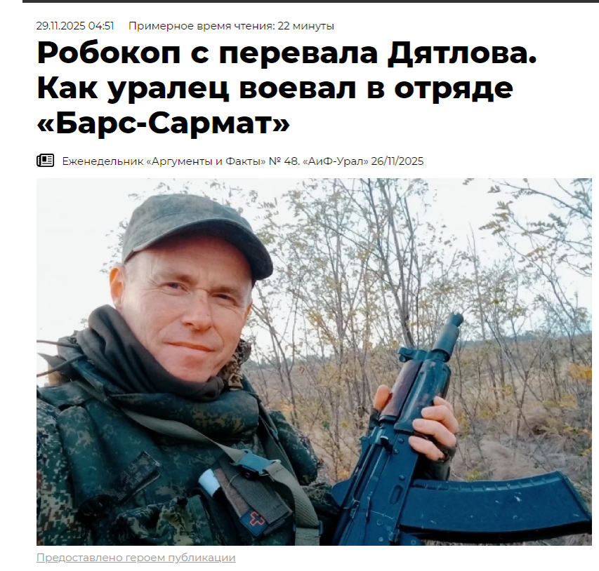 После возвращения с СВО автор канала "РС" (ноябрь 2025) подвергся вниманию целого ряда СМИ, желавших сделать материал со мной на эту тему. Большинству отказал, потому что я отнюдь не главный герой идущей тяжёлой войны и светиться повсюду не следует, да и пересказывать тут и там имеющиеся у меня воспоминания и факты тоже как-то нудновато. Однако когда об интервью попросила газета "Аргументы и Факты - Урал" устами своего журналиста Алексея Смирнова, я отказать не смог. Его я знаю давно как опытного, разумного профессионала, который всегда делает своё дело блестяще (а раньше мы неоднократно разговаривали на разные интересные темы). Поэтому согласился без раздумий. И после выхода статьи был в очередной раз приятно поражён умением Алексея задавать нужные вопросы и потом передать верно мои ответы на них.