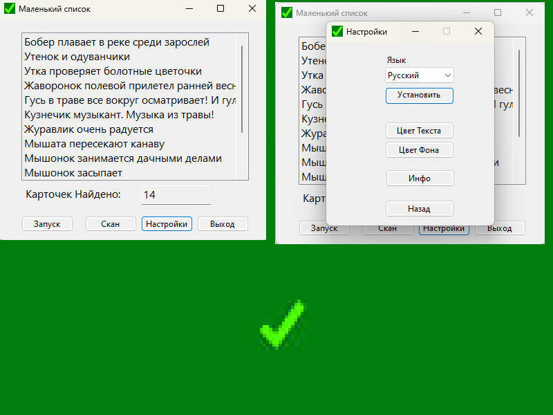 Добрые Зверята Карточки продолжаются. Еще тут есть программка Маленький Список. Она просто показывает все карточки которые у тебя есть. Карточки теперь хранятся в папке Cards. И Программка сама их сканирует. То есть пытается распознать карточки. В прошлой версии все карточки были просто запрограммированы через прямой путь для запуска. На этот раз сначала ищется карточка. А потом заносится в список. Поиск идет по шаблону. По имени карточки. Если есть – то добавляется. Также указывается количество карточек. В отдельном текстовом формате. Также можно просканировать папку в любой момент. Нажав кнопку скан. Это сокращение от сканирование. Вот таким нехитрым путем программа доросла уже до версии 0.2. Программа – это просто список карточек. Оттуда можно запустить карточку. И просто имя карточки там пишется. В текстовой форме. Создана программа для отображения карточек. И для расширения идеи Добрые Зверята карточки. Чтобы помимо самих карточек, было еще что-то. Сначала простое. А потом и чт