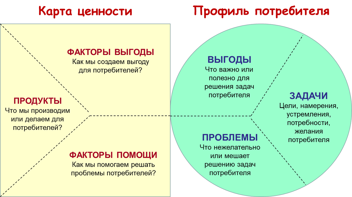 Если очень кратко, то для определенного бизнес-сегмента мы должны заполнить шаблон ценностного предложения, состоящий из двух частей: профиля потребителя и карты ценности. Сначала находимся на стороне потребителя и заполняем шаблон справа налево в следующей последовательности: