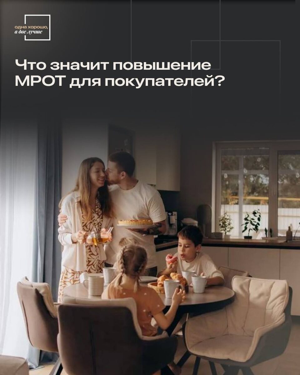 С 1 января 2026 года минимальный размер оплаты труда вырастет на 20,7% и составит 27 093₽ А это значит, что многие из нас станут чуточку платежеспособнее в глазах банка)) Размер вашей официальной зарплаты или среднего заработка — это основа для расчета максимальной суммы кредита: чем выше МРОТ и, как следствие, официальные зарплаты, тем большую ипотеку вам может одобрить банк Так же от МРОТ прямо зависят несколько важных пособий: ➡ Пособие по уходу за ребенком до 1.5 лет для неработающих родителей или ИП ➡ Больничные и декретные для самозанятых и ИП, платящих добровольные взносы в Соцфонд Для банка такие выплаты — это стабильный дополнительный доход вашей семьи. Когда они вырастают, ваша суммарная платежеспособность повышается вместе с шансами на одобрение ипотеки Мы рады любой положительной динамике со стороны государства, ведь даже дополнительные 5 000₽/мес могут значительно повлиять на покупку! 🔥 ❗Но у новости есть и обратная сторона: с нового года ожидается очередной рост цен. П
