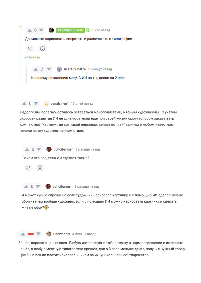 Я родилась в 1983 году и застала и ЧБ фотоаппараты Зенит и Палароиды и первые компы и Фотошоп и вот уже и ИИ во всех сферах деятельности. Я мясной художник акварелист, по крайней мере так в комментах пишут). И сколько себя помню, столько хоронят мою профессию. А мне это всё, что должно было убить профессию художника наоборот помогало в творчестве! По ЧБ фоткам, которые снимал мой папа я рисовала портреты. По цветным уже и пейзажи и натюрморты. В фотошопе работала дизайнером и рисовала в 2д иллюстрации. В ИИ сейчас иногда генерю себе референсы по собственным идеям и промтам. Пример прикреплю: А ещё эти хоронители художников и фотографов забывают важную вещь - любая иишка накормлена до отвала именно рукотворными работами тех самых мясных творцов! И основываясь на этих изображениях создает что то новое и уникальное и это и круто и полезно, но никогда не убьет настоящие профессии, по крайней мере мне в это хочется верить). На рынке тонны носков на любой цвет и выбор, но самыми теплыми буду