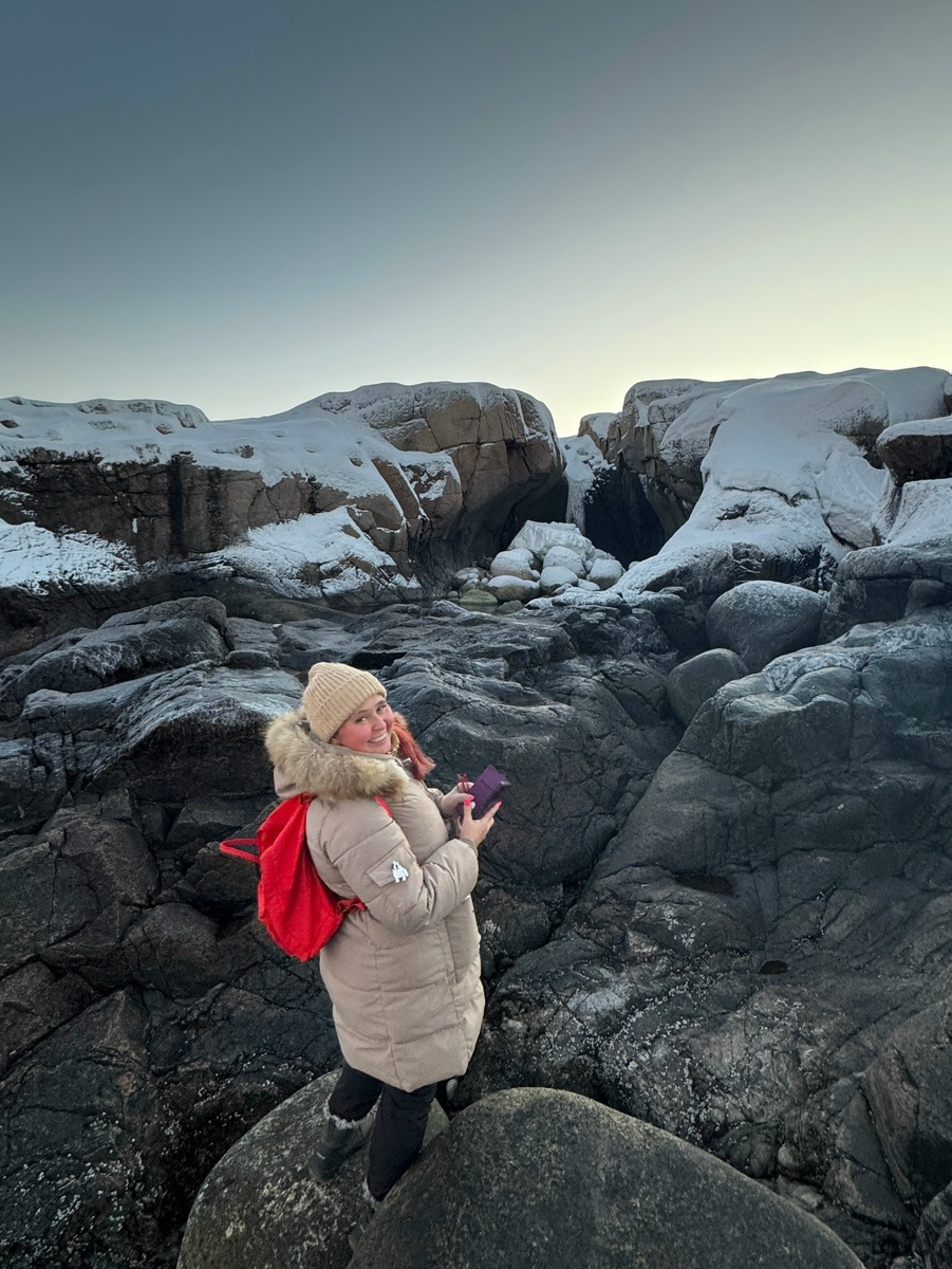 Как иногда думаешь, что всё уже интересное видел, и не чему уже удивиться, как наступает очередной день в Териберке… С каждым днем всё новые и интересные локации, захватывающие дух и создающие ощущение нереальности нахождения! Действительно, ли это со мной? Не сон, который вернет меня обратно в квартиру в городе? А нет не сон, и колючий холодный ветер, и звуки волн возвращают в реальность Севера. Мы идем мимо домовой церкви Тихвинской иконы. В первые мы улучили момент туда заглянуть на пару минут, ведь обычно двери туда закрыты, а службы идут не часто. Дальше самое функциональное здание Лодейного, где и почта и банк и полиция, с медпунктом и библиотекой. И только после мы вышли к национальному парку Териберка, вход который обрамляет простецкие ворота, чем-то напоминающие японские ворота Тории. В небе над ними висела полная луна, в окружении розового отсвета неба. Дополнение к ощущениям востока китайские иероглифы, то там то здесь написанные туристами из поднебесной на снегу. Перв