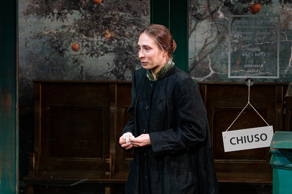 На сцене — декорации уютного литературного кафе. Несколько столиков, барная стойка и множество шкафов с книгами. На люстре закреплены раскрытые книги. Это место как символ безопасности, интеллектуального уюта, диалога, света культуры. Место, где царит разум. Доброжелательная обстановка будто бы располагает к тёплой беседе, и зритель вовсе не ожидает предстоящего конфликта. Он расслаблен атмосферой кафе, и от этого предстоящее вторжение эмоционального хаоса ощущается острее.