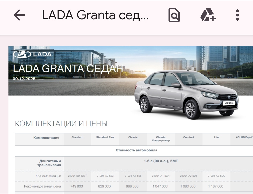 Добрый вечер. Решил сравнить комплектацию Лада Гранта Норма 2012 г., когда она только появилась в продаже, именно такую "ласточку" я себе купил и более современную генерацию с более симпатичной внешностью, но с весьма спорной начинкой, но об этом позже. Напомню, что Гранта 2012 г. выпуска был по настоящему народным автомобилем, который пришел на смену Калине в кузове седан. Машина получилась более современной , так и по цене была дешевле! Сейчас в это трудно поверить, последнее время цена на авто неизменно подрастает несколько раз в год. Мой автомобиль стоил 300 т.р.,( была еще проще комплектация с черными бамперами и пожалуй новую Гранту надо было бы сравнивать с ней). Сравнивать буду с Грантой Стандарт +, (в конце объяснения почему). На сегодня стоимость авто 829 т.р., т.е. стоимость за последние 10 с "хвостиком" лет увеличилась почти в три раза! И что же мы получаем за эти деньги? Будем посмотреть: Комплектация 21904-А0-5Е3 В начале списка опций вроде все совпадает