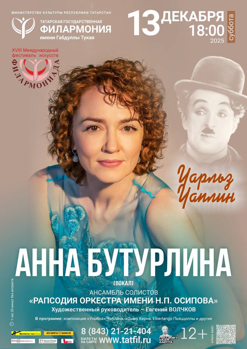Казань, 13 декабря мы выступим у вас с уникальной программой "Чарльз Чаплин". Впервые я буду и певицей и чтецом в одном лице. Вместе с ансамблем народных инструментов "Рапсодия оркестра имени Н.П. Осипова" мы расскажем вам о судьбе великого актёра и режиссёра. https://tatfil.ru/poster/vokal_naya_muzyka_s_orkestrom/rapsodiya-orkestra-imeni-osipova-i-anna-buturlinan-ncharlz-chaplin/ Мы вас ждём в Татарской филармонии🐦🔥 С любовью, ваша ǟռռǟ