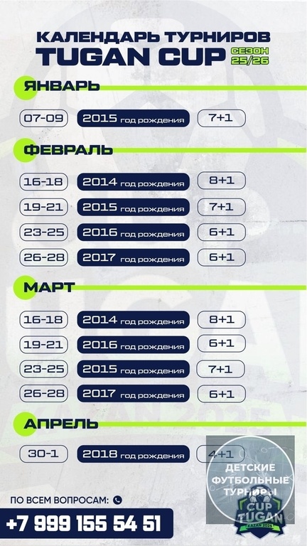 🏆 Название серии турниров: TUGAN CUP 🏆⚽ Сезон 2025/26 📅 🗓️ Календарь турниров: ❄️ ЯНВАРЬ 07–09 января → 2015 г.р. | Формат 7+1 ⚽ ❄️ ФЕВРАЛЬ 16–18 февраля → 2014 г.р. | Формат 8+1 ⚽ 19–21 февраля → 2015 г.р. | Формат 7+1 ⚽ 23–25 февраля → 2016 г.р. | Формат 6+1 ⚽ 26–28 февраля → 2017 г.р. | Формат 6+1 ⚽ 🌸 МАРТ 16–18 марта → 2014 г.р. | Формат 8+1 ⚽ 19–21 марта → 2016 г.р. | Формат 6+1 ⚽ 23–25 марта → 2015 г.р. | Формат 7+1 ⚽ 26–28 марта → 2017 г.р. | Формат 6+1 ⚽ 🌼 АПРЕЛЬ 30 апреля – 1 мая → 2018 г.р. | Формат 4+1 ⚽ 📍 Место проведения: Казань, Республика Татарстан 🏙️ 📞 По всем вопросам: +7 999 155 54 51 📱📲 🔥 Готовьтесь к сезону! Записывайтесь заранее — мест в турнирах ограничено! ⏳🎉 --- #ФутбольныйТурнирЯнварь2026 #ФутбольныйТурнирФевраль2026 #ФутбольныйТурнирМарт2026 #ФутбольныйТурнирАпрель2026 #ФутбольныйТурнирЦентральнаяРоссия2026 #ФутбольныйТурнирКазань2026 #ФутбольныйТурнирКазань2014гр #ФутбольныйТурнирКазань2015гр #ФутбольныйТурнирКазань2016гр #ФутбольныйТурн
