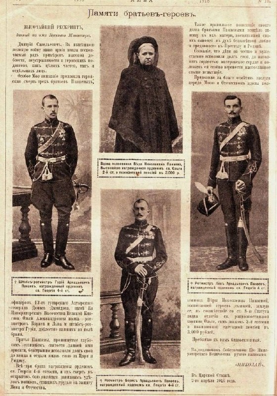 ВЕЧЕРНИЙ ЗВОН: герои уходящего дня В День Георгиевских кавалеров – так назывался до 1917 года сегодняшний праздник - вспомним вместе с журналом «Родина» братьев Панаевых, посмертно награжденных орденом Св. Георгия 4-й степени. И их маму… «К началу Первой мировой войны братья служили в знаменитом 12-м Ахтырском гусарском генерала Дениса Давыдова полку. Первым погиб самый опытный, 36-летний Борис. В августовских боях 1914 года он со своим эскадроном атаковал вражескую кавалерийскую бригаду, в короткое время был дважды ранен, в том числе тяжело, в живот. Превозмогая страшную боль, вступил в схватку с командиром врага. Несколькими пулями в голову был убит наповал... Через две недели в Галиции погиб 35-летний Гурий. За несколько минут до смерти он вынес с поля боя раненого гусара. «Тело его было найдено у убитой лошади, узду которой он и мертвый продолжал держать в руке. Поразительную красоту смерть наложила на его лицо. Гурий хоронил своего брата Бориса, Лев хоронил Гурия...», - вспоми