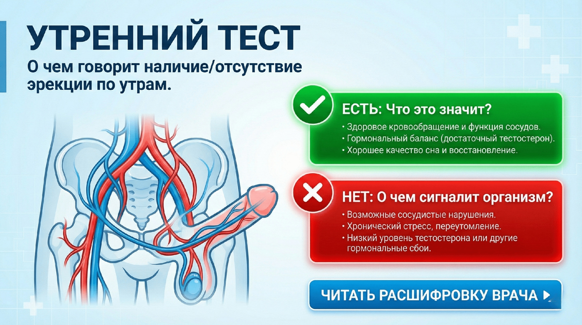 Нюанс: Если эрекции нет 1–2 дня — это не повод для паники. Алкоголь, сильная усталость или плохой сон могут временно «выключить» рубильник.