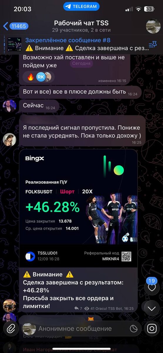 #результаты #tssoracul Сегодня все снова отлично поработали и провели удачную сделку по алгоритму TSS +46% Всех кто принял участие с профитом 😎✅✌🏼 Результаты прикрепляю😎 Бонусы от BingX 👈