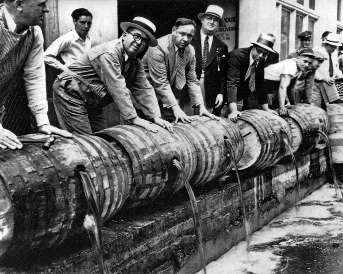 С января 1920 по декабрь 1933 в США был запрещён оборот, транспортировка и продажа алкогольных напитков. На этой постановочной фотографии федеральные агенты выбрасывают бочки с нелегальным алкоголем. Это изображение начала 1930-х типично для фотографий, сделанных во времена «сухого закона» для популяризации правоприменительной деятельности «сухих агентов», как их называли. На самом деле правоприменение в период «сухого закона» было неравномерным, так как федеральных агентов было недостаточно - 3000 на все 48 штатов, а среди агентов процветала коррупция. Полиция часто была слишком плохо финансирована, чтобы заниматься ещё и законами о запрете алкоголя. В крупных городах, таких как Нью-Йорк, которые выступали против сухого закона, стали популярны подпольные бары — небольшие клубы, где нелегально продавали алкоголь. К 1922 в Нью-Йорке насчитывалось более 5000 подпольных баров; несколько лет спустя их было уже 100 000. До введения сухого закона легальных мест, где можно было выпить, было