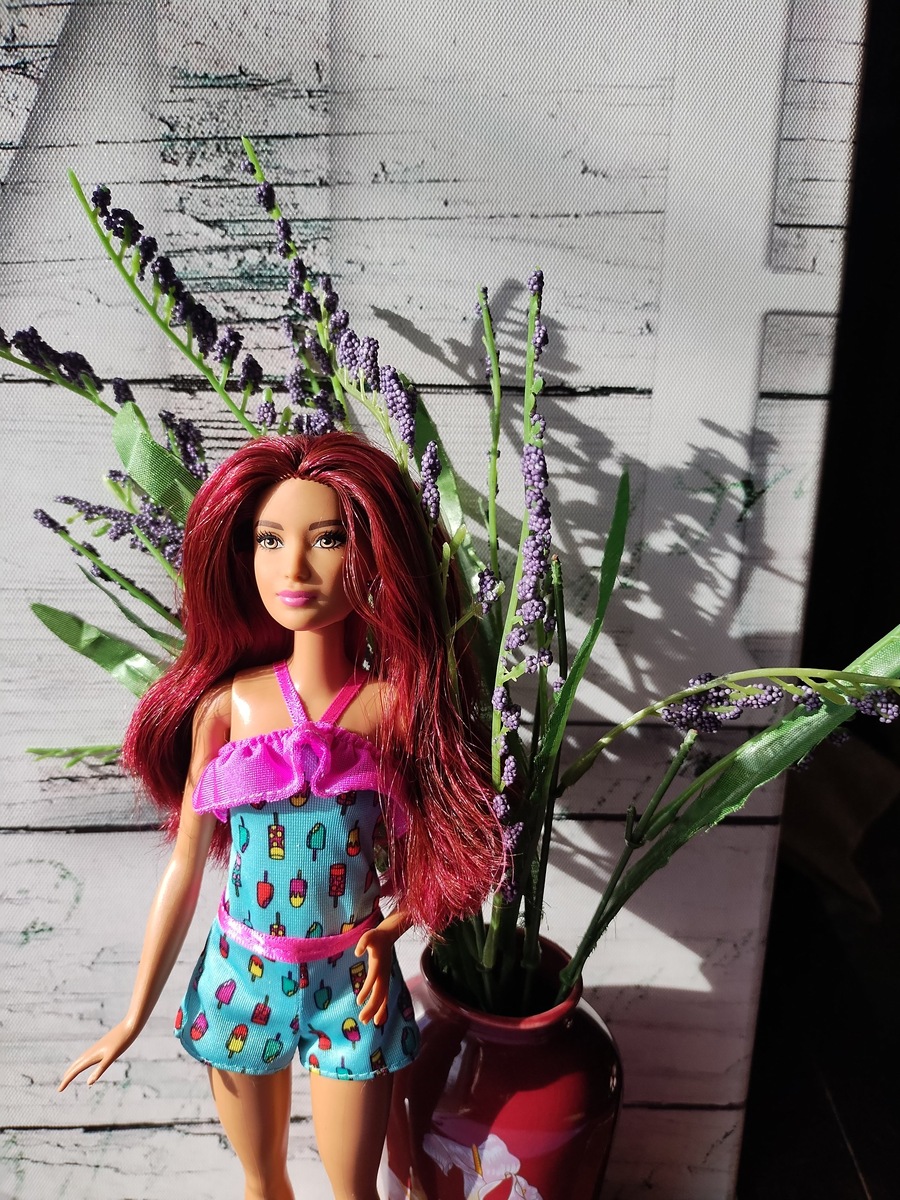 Всем доброго дня! Хочу показать свою новенькую девочку и спросить совета Купила недавно очень красивую фешенку. Я прямо не могу налюбоваться на ее нежное очаровательное личико, - по моему это молд Годдес. Барби на этом молде все просто невероятные красотки. Очень удачный молд. Но, как все фешенки, она на деревянном, как раз очень неудачном теле. Одна рука вытянута вперед, я этого терпеть не могу. Ну и соответственно, с позами не разгонишься. То есть, нужно ей подарить другое, подвижное тело. А скинтон очень специфический, и не темный, и не светлый, а нечто посредине. Вобщем трудно подобрать тело по скинтону. Я на нее пока смотрю, в целом ее образ завершенный, и фигурка очень красивая, но вот неподвижность... Что бы вы посоветовали? оставить на родном теле? Но тогда фотосессии с ней будут очень скромными, а мне очень хочется ее снимать. И не только в родном комбинезоне, я уверена, что в других одеждах я эта Барби раскроется как цветок. Пока что я сделала ознакомительную фотосессию,