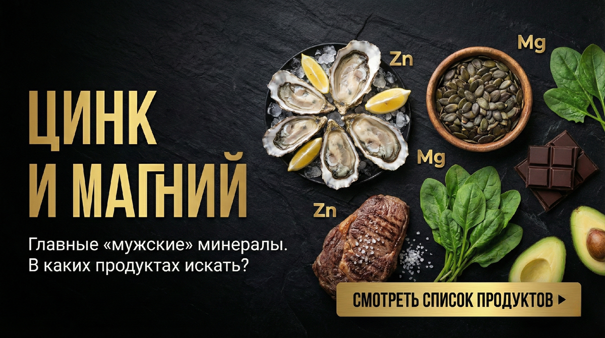 Вы покупаете дорогие протеины, пьете модные бустеры тестостерона (вроде Трибулуса), но ваши результаты в зале стоят на месте, а либидо оставляет желать лучшего? Скорее всего, вы пытаетесь построить небоскреб без фундамента. В мужском организме есть два ключевых минерала, дефицит которых мгновенно бьет «ниже пояса» и по нервной системе. Это Цинк (Zn) и Магний (Mg). По статистике, 70% мужчин живут в хроническом дефиците магния, а цинк мы теряем буквально с каждым походом в туалет или спортзал (он выходит с потом и семенной жидкостью). Давайте разберемся, зачем они нужны и, главное, что съесть, чтобы восполнить запасы без аптечной химии. 1. Цинк: Архитектор вашей мужественности Цинк — это не просто минерал для иммунитета. Для мужчины это строительный материал. За что отвечает: Синтез Тестостерона: Молекулы гормона строятся при участии цинка. Нет цинка — завод встал. Качество спермы: Цинк критически важен для подвижности и количества сперматозоидов. Защита от Эстрогена: Цинк — естественн