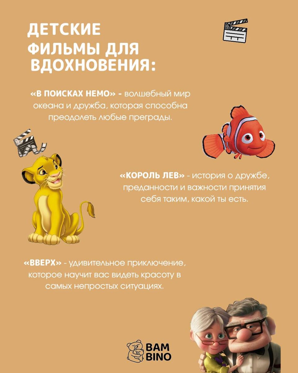 🎬 Подборка фильмов, которые наполняют сердце теплом и вдохновляют мечтать! 🧡 Детские истории умеют напоминать о главном — о доброте, дружбе и вере в себя. • «В поисках Немо» — волшебный мир океана и дружба, способная преодолеть любые преграды🐠 • «Король Лев» — история о верности, смелости и принятии себя таким, какой ты есть. 🦁 • «Вверх» — удивительное приключение, которое учит видеть красоту даже в самых непростых ситуациях. 🎈🏠 💬 А какой фильм чаще всего пересматриваете всей семьёй? Делитесь в комментариях! 👇🏻