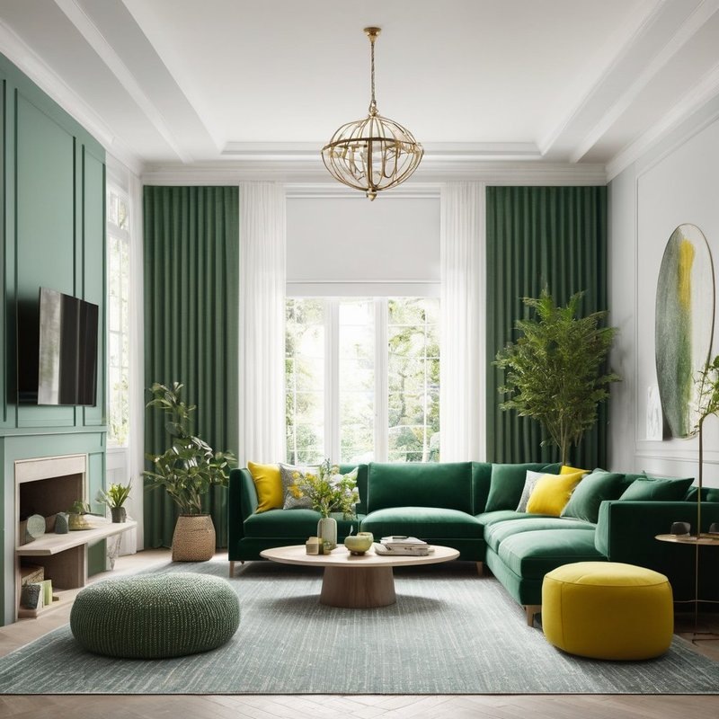 В интерьере, оформленном в теплых бежевых и коричневых тонах, акцентные элементы в ярко-синем или изумрудном цвете создают эффектный контраст. Например, мягкие диваны и текстиль в нейтральных оттенках прекрасно сочетаются с синими подушками и зелеными картинами. Это решение подчеркивает уют и стиль, сохраняя при этом гармонию.