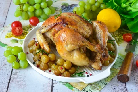 Курица с виноградом — это элегантное, вкусное и не слишком сложное блюдо. Сочетание нежного мяса и сладковатого винограда с пикантными нотками — это классика французской и средиземноморской кухни. Вот базовый рецепт, на который можно опираться, с вариантами и советами. Курица с виноградом (классический рецепт в духовке) Ингредиенты (на 4 порции): · Курица: 8 бёдрышек или голеней (можно взять целую курицу, разрубленную на части, или только филе). · Виноград: 300-400 г спелого белого или красного винограда (без косточек). Лучше взять сладкие сорта. · Лук: 1 крупная луковица (порезать полукольцами или дольками). · Чеснок: 3-4 зубчика (грубо порубить). · Тимьян: 3-4 веточки свежего (или 1 ч.л. сушёного). · Белое вино: 100-150 мл (сухое, например, Совиньон Блан). Можно заменить куриным бульоном. · Бульон: 100 мл куриного бульона. · Сливки 10-20% (или сметана): 100-150 мл (по желанию, для более нежного соуса). · Масло: оливковое или сливочное для жарки. · Соль, свежемолотый чёрный перец.