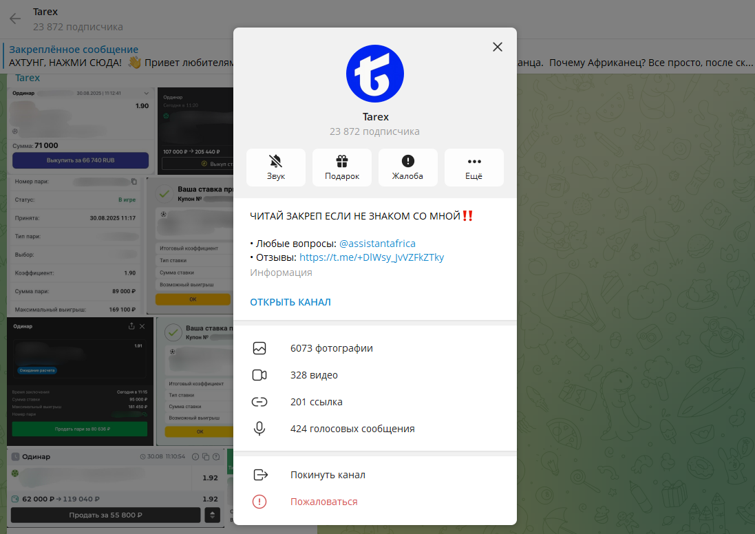 Канал Tarex в Telegram обещает «секретные инсайды», «революционную аналитику» и «почти гарантированную проходимость». Автор уверяет, что его схема работает годами, а информация поступает от глобальной сети информаторов. Но за этим фасадом скрывается всё тот же старый обман Африканца — человека, который постоянно перезапускает свои провальные ставочные каналы под новыми именами. 👉 Если хотите зарабатывать без скама — вот проверенный вариант. 🔍 Обзор проекта Tarex появился в Telegram совсем недавно, но стиль оформления и подача — полностью калька с его предыдущих проектов: