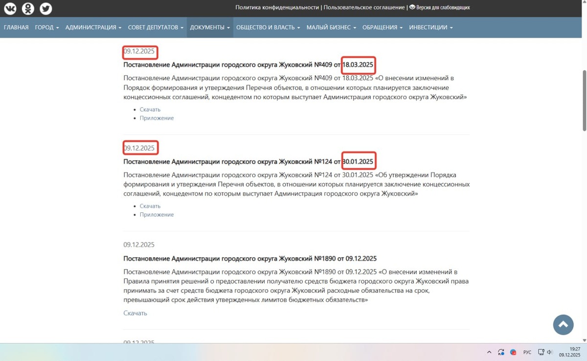Свежие новости от администрации Пака: 9 декабря опубликованы постановления, подписанные прежним главой Жуковского Борисом Аубакировым в начале 2025 года. Речь о формировании и утверждении Перечня объектов, в отношении которых планируется заключение концессионных соглашений, концедентом по которым выступает мэрия. Список муниципального имущества, которое власти передадут в пользование частному бизнесу для извлечения прибыли, но без передачи в собственность, должен утверждаться постановлением администрации ежегодно до 1 февраля и публиковаться на её сайте. В него могут включаться объекты теплоснабжения, водоснабжения и водоотведения после технического обследования имущества, предлагаемого к включению в концессионное соглашение. Результаты обследования тоже должны быть обнародованы. Составлялся ли такой перечень в 2025-м, видимо, узнаем от местных властей в следующем декабре. На их сайте его нет. Также вполне вероятно, что публикация постановлений с годовым опозданием — "артподготовк