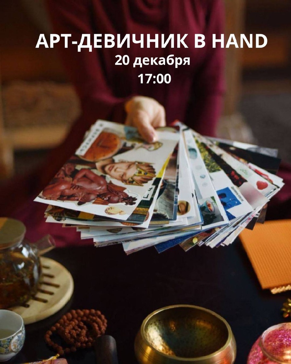 АРТ-ДЕВИЧНИК В HAND 🌟 20 декабря мы ждем вас, чтобы: 🪄 Поиграть в авторскую трансформационную игру Синяя птица. Через вопросы, подсказки и аффирмации игра позволит взглянуть на ситуацию со стороны и увидеть скрытый потенциал и возможности. 🎴 Поработать с авторскими ресурсными колодами метафорических карт. Найдем путь к подсознанию и получим ответы на вопросы. ⚡️Создать свои собственные карты в технике soul collage. В процессе происходит пробуждение интуиции, креативности и духовной сущности каждой участницы. Арт-девичник проведёт Анна Науменко — учитель йоги, ведущая трансформационных игр, арт- и спа-девичников, автор игр и колод МАК, организатор фестиваля духовных практик, регрессолог, гипнолог. 🗓️ 20 декабря, 17:00-20:00 Регистрация — @handyogastudio 💚