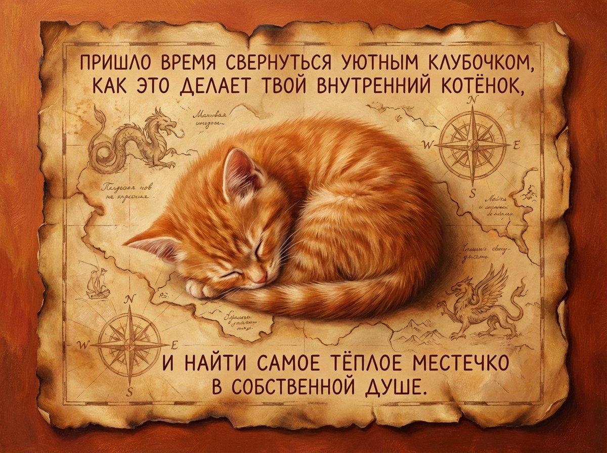 Смотри, как за окном сгущается бархат ночи. Пусть день со всеми его заботами мягко растает, словно след на росе. Пришло время свернуться уютным клубочком, как это делает твой внутренний котёнок, и найти самое тёплое местечко в собственной душе. Прислушайся к своему мурчанию — это мелодия твоего сердца, которая знает всё о покое и умиротворении. Каждый вдох наполняет тебя тишиной звёздного неба, а каждый выдох уносит прочь дневную суету. Позволь себе эту драгоценную паузу, этот момент нежности к себе. Ты заслуживаешь самого сладкого сна, полного волшебных и светлых грёз.