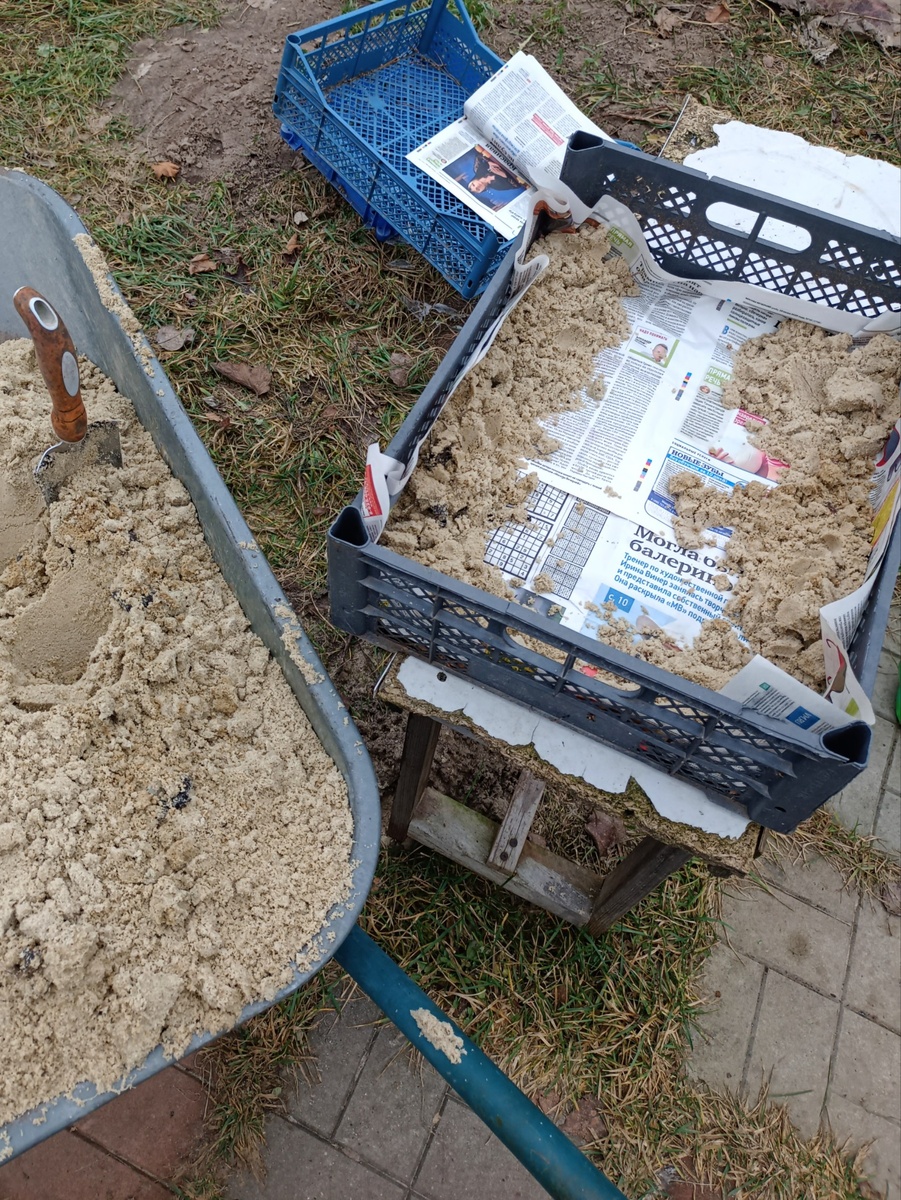 Готовлю ящики для высадки тюльпанов. Ящик обычный, овощной. На дно газету. И сантиметров 6 песка.