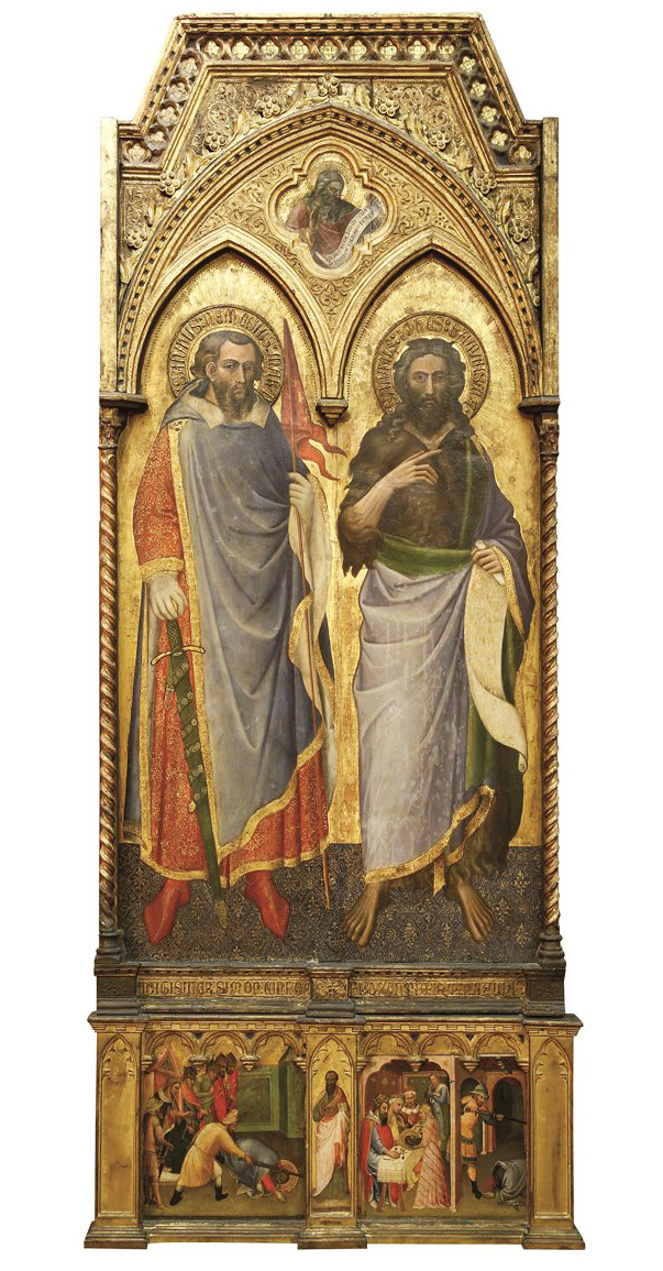 Сколь бы монументальной она ни казалась, эта картина представляет собой лишь фрагмент: изначально она была левой панелью огромного алтаря. На основных полях изображены Святой Немезий, римский воин, казнённый за христианскую веру, и Святой Иоанн Креститель. Вознесение Богородицы когда-то появлялось на ныне утраченном центральном поле, а ещё двое святых, Бенедикт и дочь Немезия, Луцилла, стояли справа (Кембридж, Массачусетс, Музей искусств Фогга). Тема пьедестала (пределлы) – мученичество святых, изображённых на основных полях. Итальянский художник Спинелло Аретино (ок. 1350–1410) работал в своём родном Ареццо и других тосканских городах (Лукка, Флоренция, Пиза, Сиена). Этот алтарный образ был написан в Лукке для оливетской церкви Санта-Мария-Нуова в Риме, где хранились мощи святых Немезия и Луциллы. Однако, возможно, он никогда не устанавливался в Риме, поскольку с середины XVI века источники упоминают его на главном алтаре церкви аббатства Монте Оливето-Маджоре, материнской обите