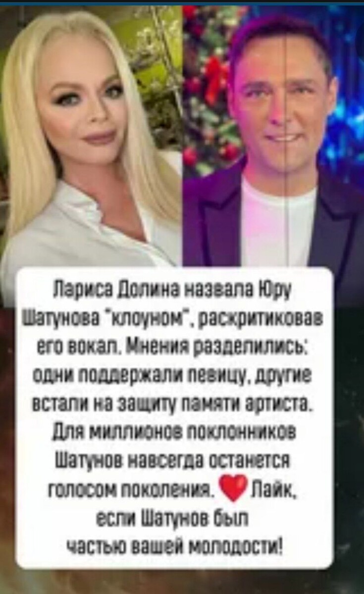Уже неоднократно Лариса Долина была замечена в невероятном цинизме и двуличности. Ещё два года назад певица приняла участие в трибьюте памяти Юры Шатунова ,спев одну из его известных песен . А уже после участия в данном концерте внезапно заявила, "Проекты бывают разные, и этот был для меня сложным в плане принятия положительного решения об участии. Разговоры о том, что у виновника этого мероприятия была нелегкая судьба, не имеют никакого отношения к нашей профессии. Феномен успеха Юрия Шатунова, как и то, что его называют “легендой”, мне до сих пор непонятен. Для меня понятие “легенда” — это нечто большее. Это Дима Хворостовский, Геннадий Гладков — я по-другому принимаю значимость человека. В любом случае участие в концерте было очередным экспериментом, которые я люблю», — заявила артистка в своем блоге." Честно говоря , подобные заявления уже после участия в концерте в память о Юре были для его поклонников полным шоком . Многие посчитали это верх цинизма , получить пиар на имени Юр