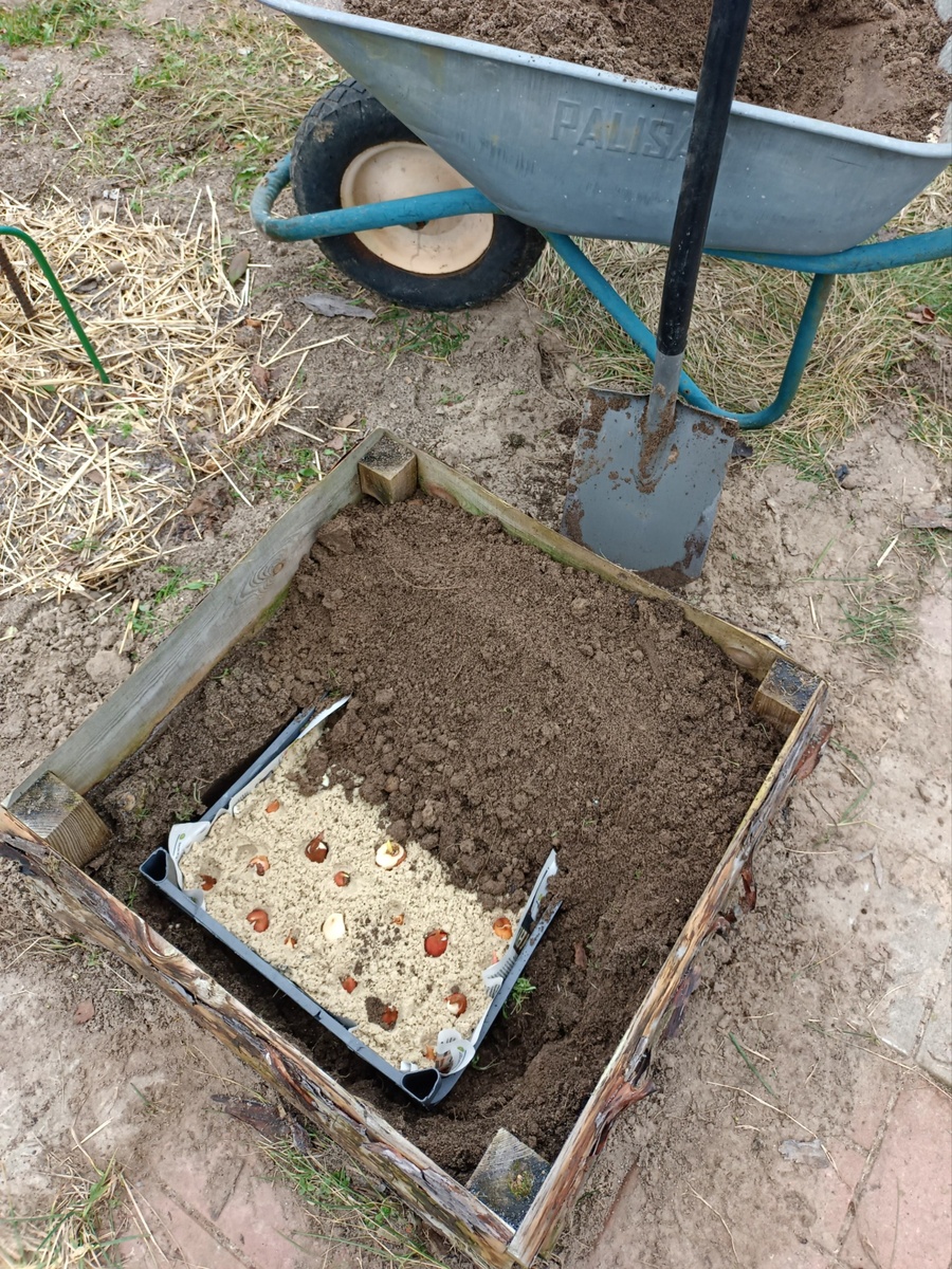 Ящик на дно клумбы. Аккуратно землю выгружаем. Из тачки. Куда ранее выкапывал. В лёгкую утрамбовать. И опилками всё засыпать можно.