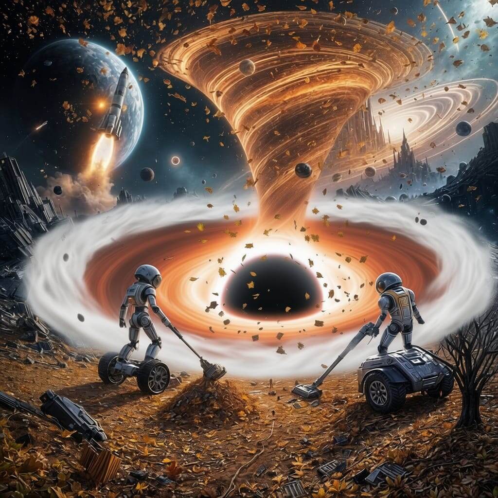 Тишина. Не та, что на планетах, а густая, ватная тишина вакуума, нарушаемая лишь редким щелчком рации. На фоне искривлённого света аккреционного диска чёрной дыры «Санитар-1337» плавно скользил, загребая гравитационным полем обломки старого спутника. Его броня, некогда белая, была исчерна поцарапана микрометеоритами. На спине кривыми буквами кто-то вывел термостойкой краской: «Подметай, пока смерч не всосал». На связь вышел «Санитар-1338», его напарник.