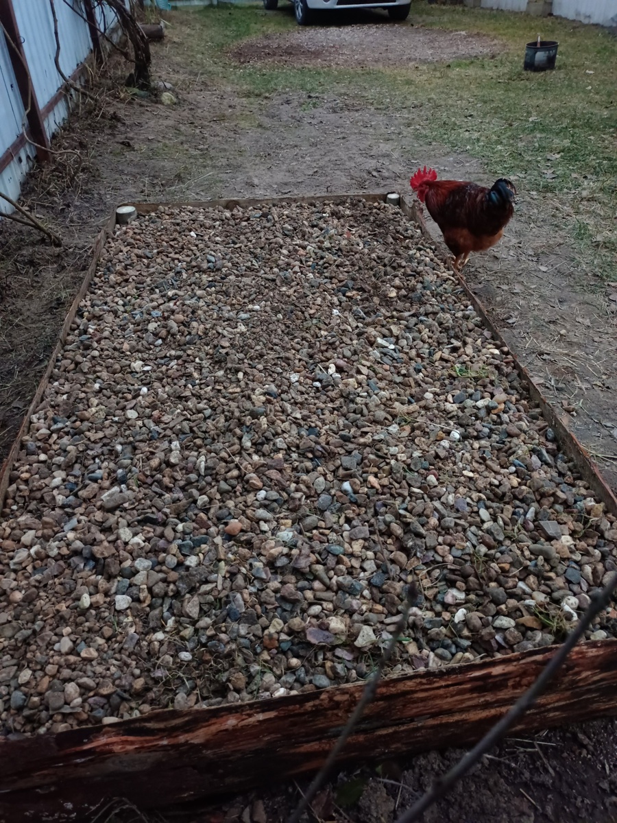 Далее занимался гравием. Несколько дней, по чуть-чуть, переношу его в ясельки. Сегодня завершил этот процесс. Получилось, что точно рассчитал кубатуру, и размеры. Поместилось практически без горки. Закрывать ничем не буду. До весны эти камушки мне не понадобятся. Пусть дожди смоют всю грязь, землю, что попалась при транзите.